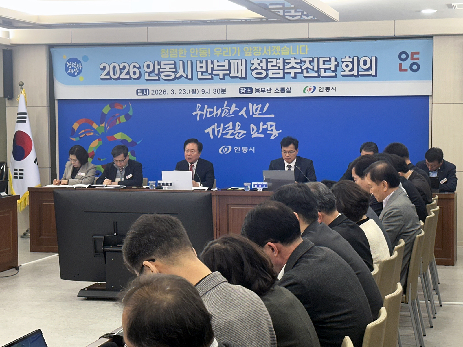 [안동=유해진 기자] 안동시는 지난 23일 웅부관 소통실에서 권기창 안동시장을 비롯한 부시장, 국․소장 등 간부공무원이 참석한 가운데 ‘2026년 반부패․청렴 추진단 회의’를 개최하고, 종합청렴도 향상을 위한 추진체계와 반부패․청렴 종합계획을 공유했다.
